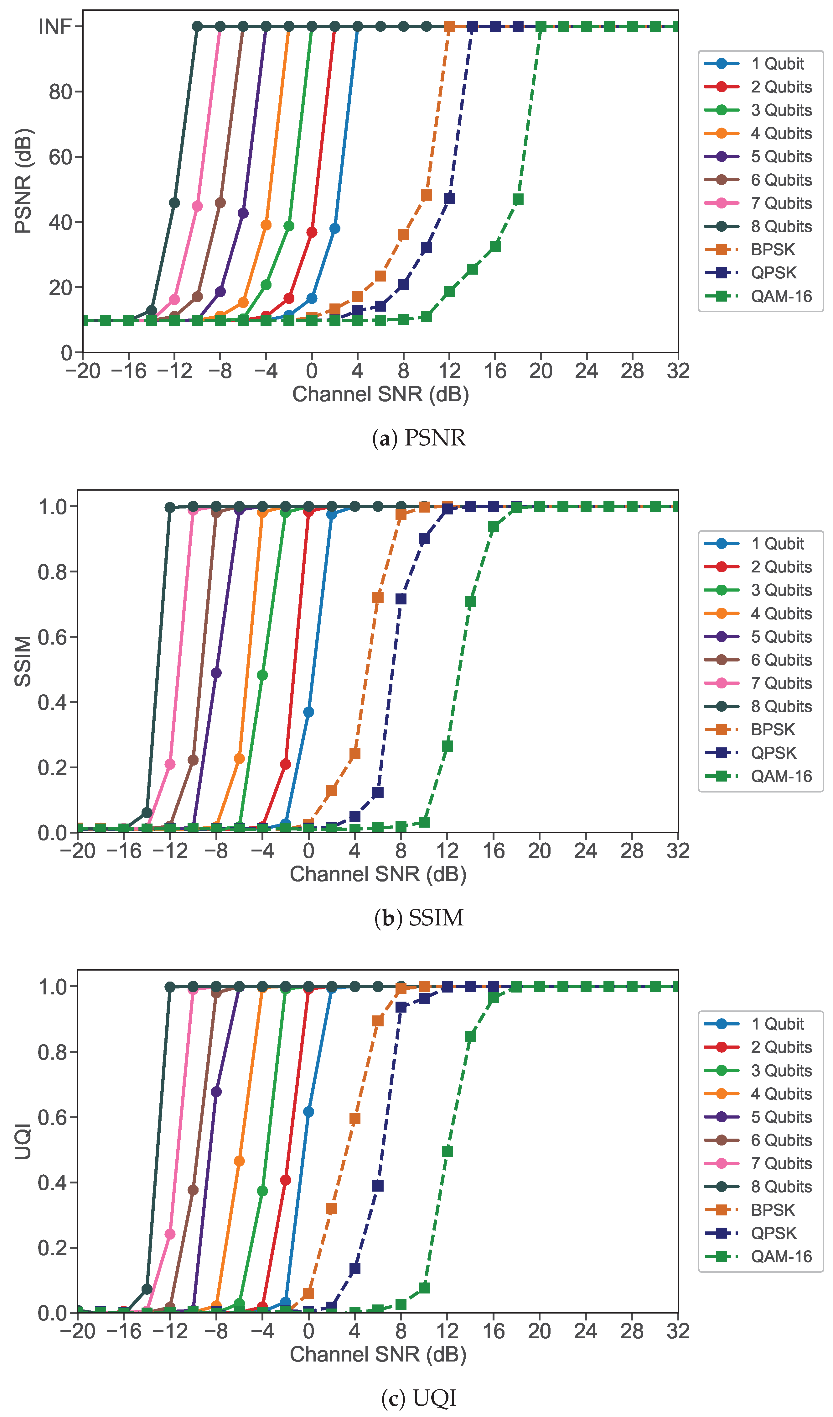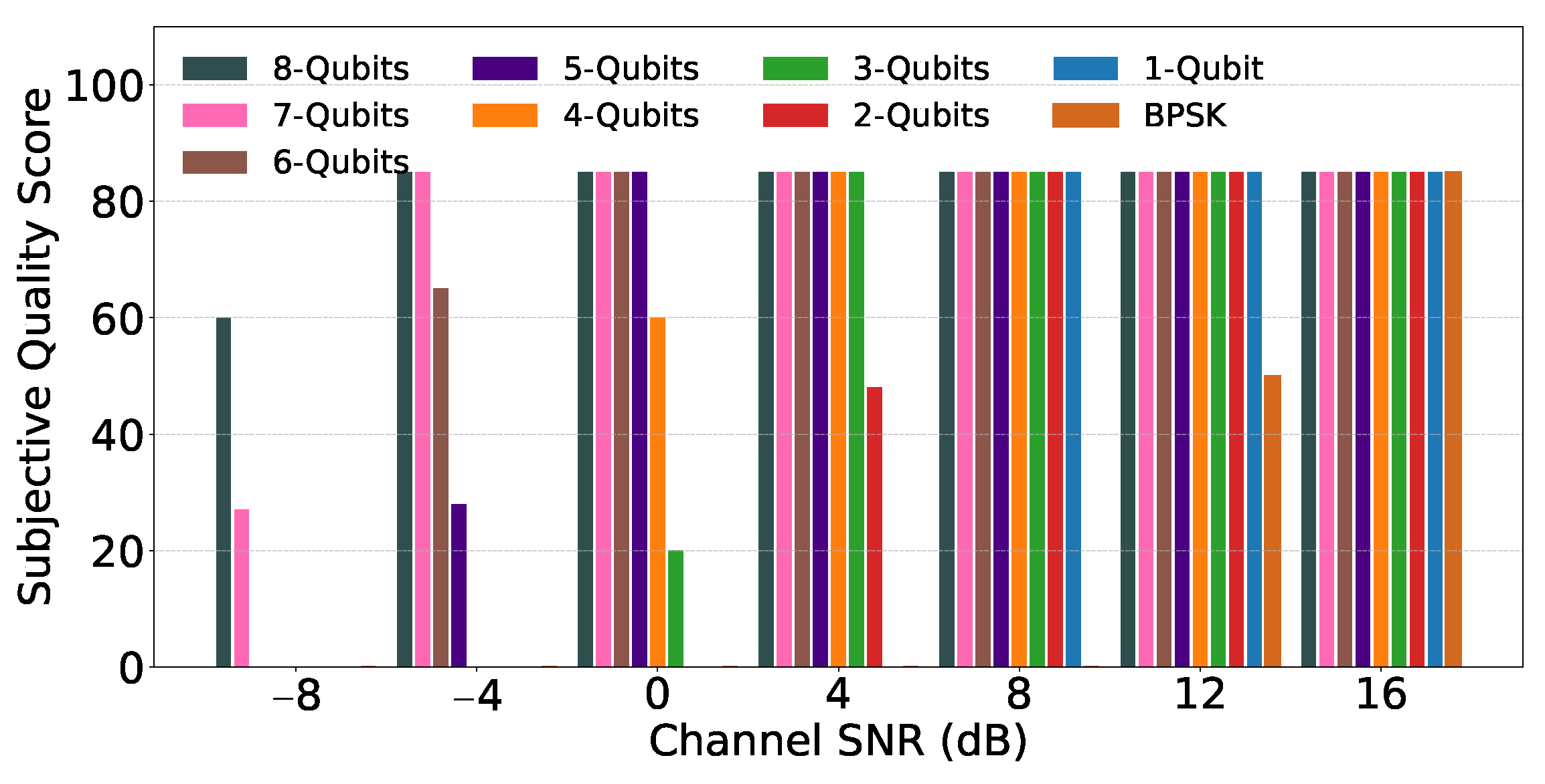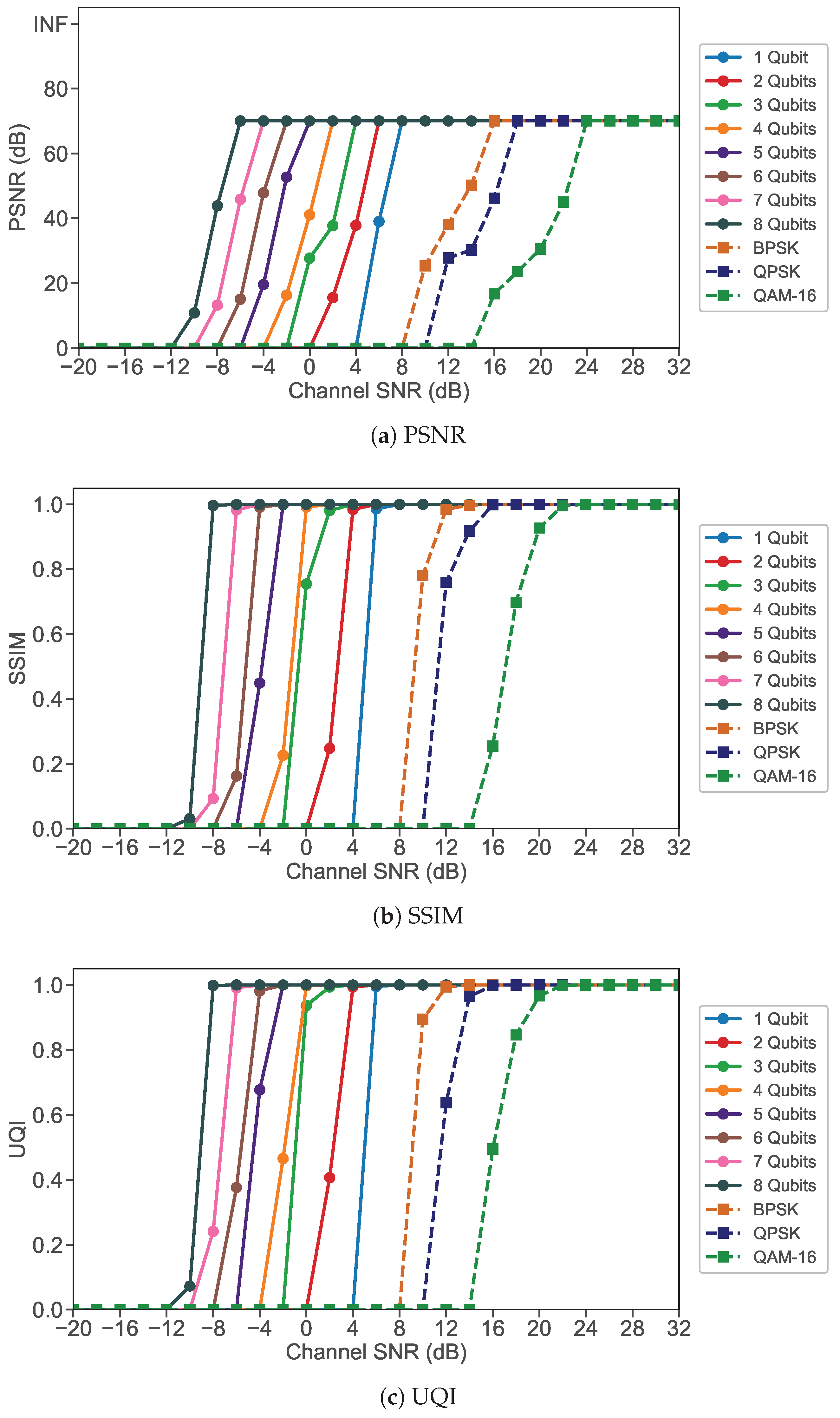 4.3. Performance Comparison of Uncompressed Image Transmission Using Quantum MIMO-OFDM and Classical MIMO-OFDM Systems