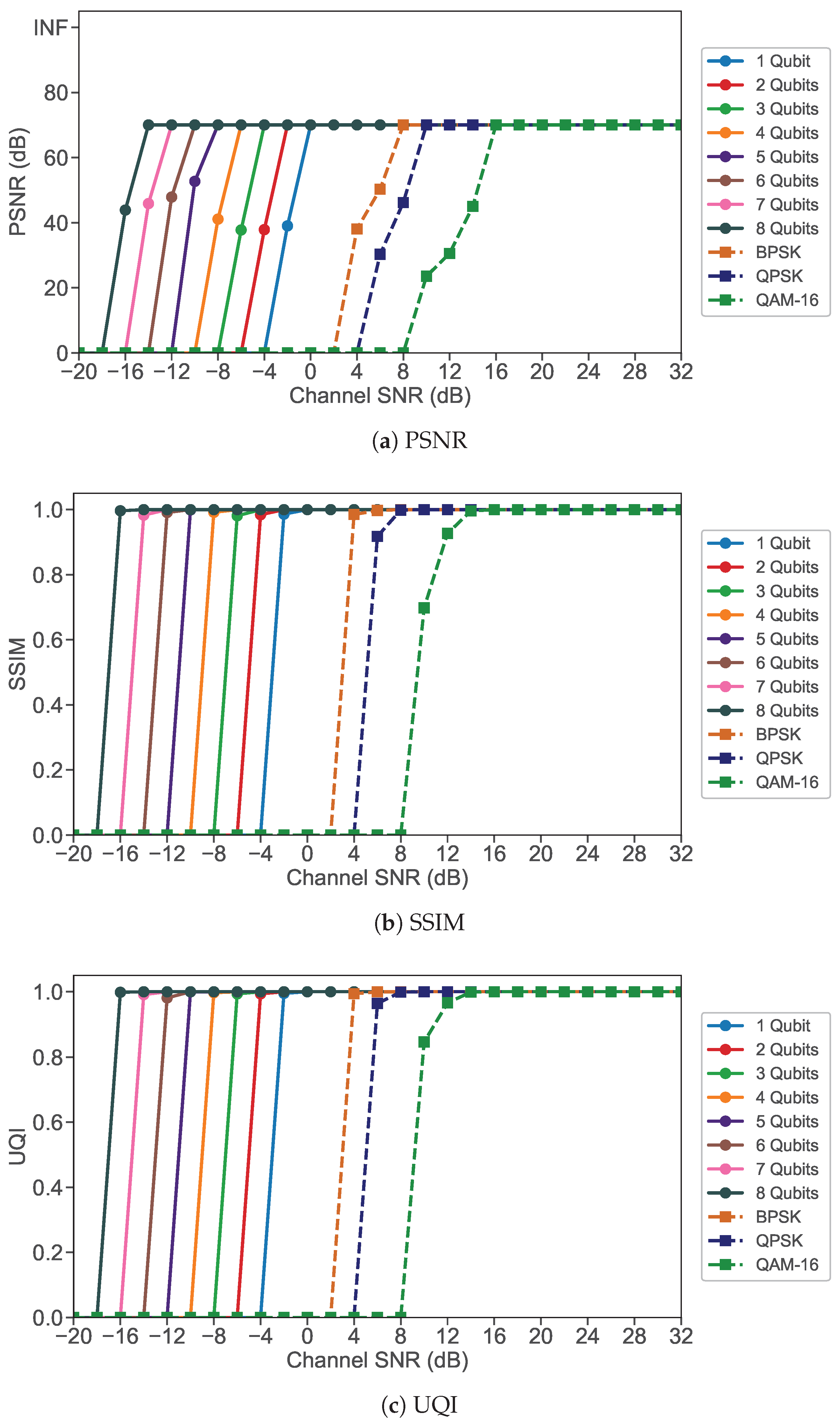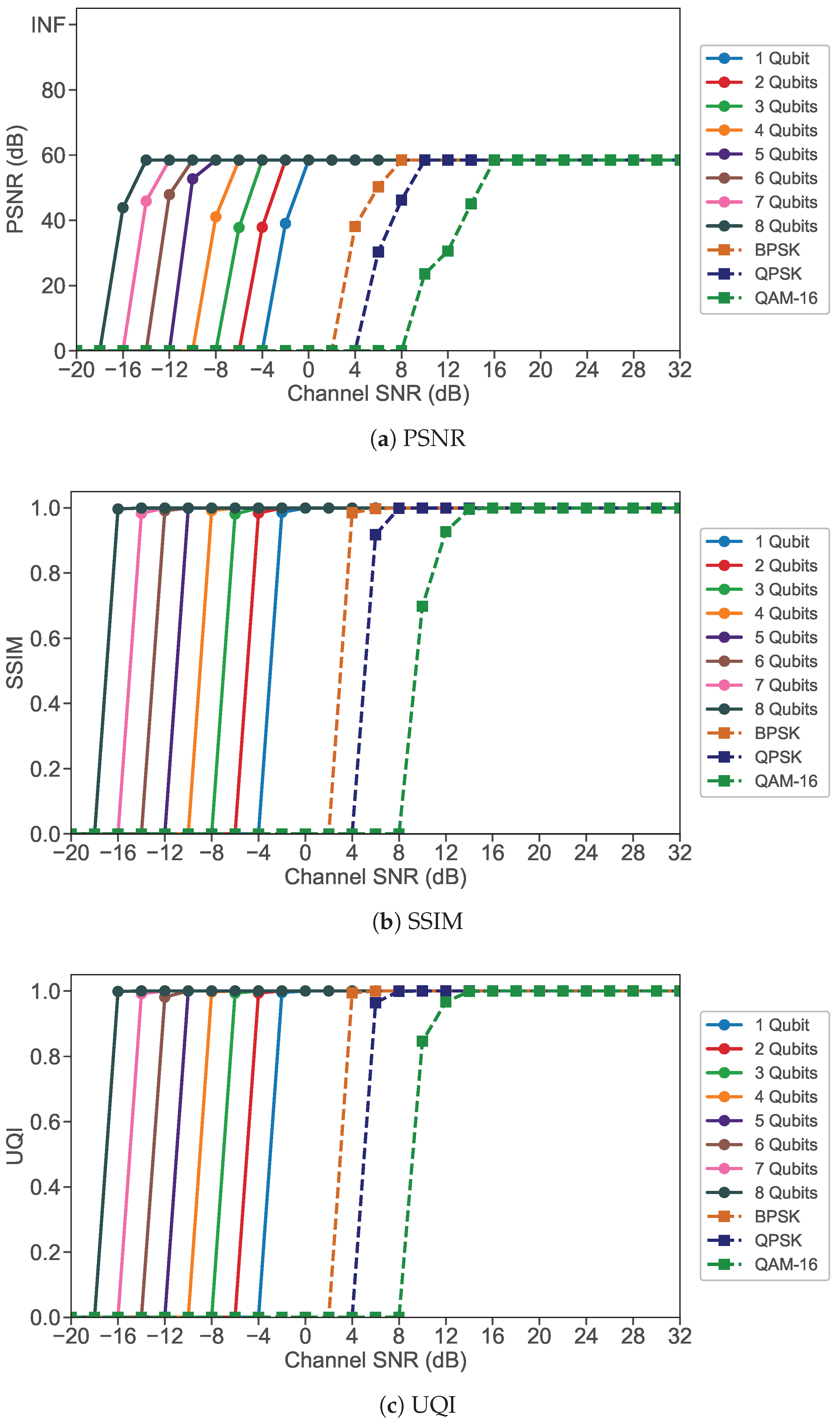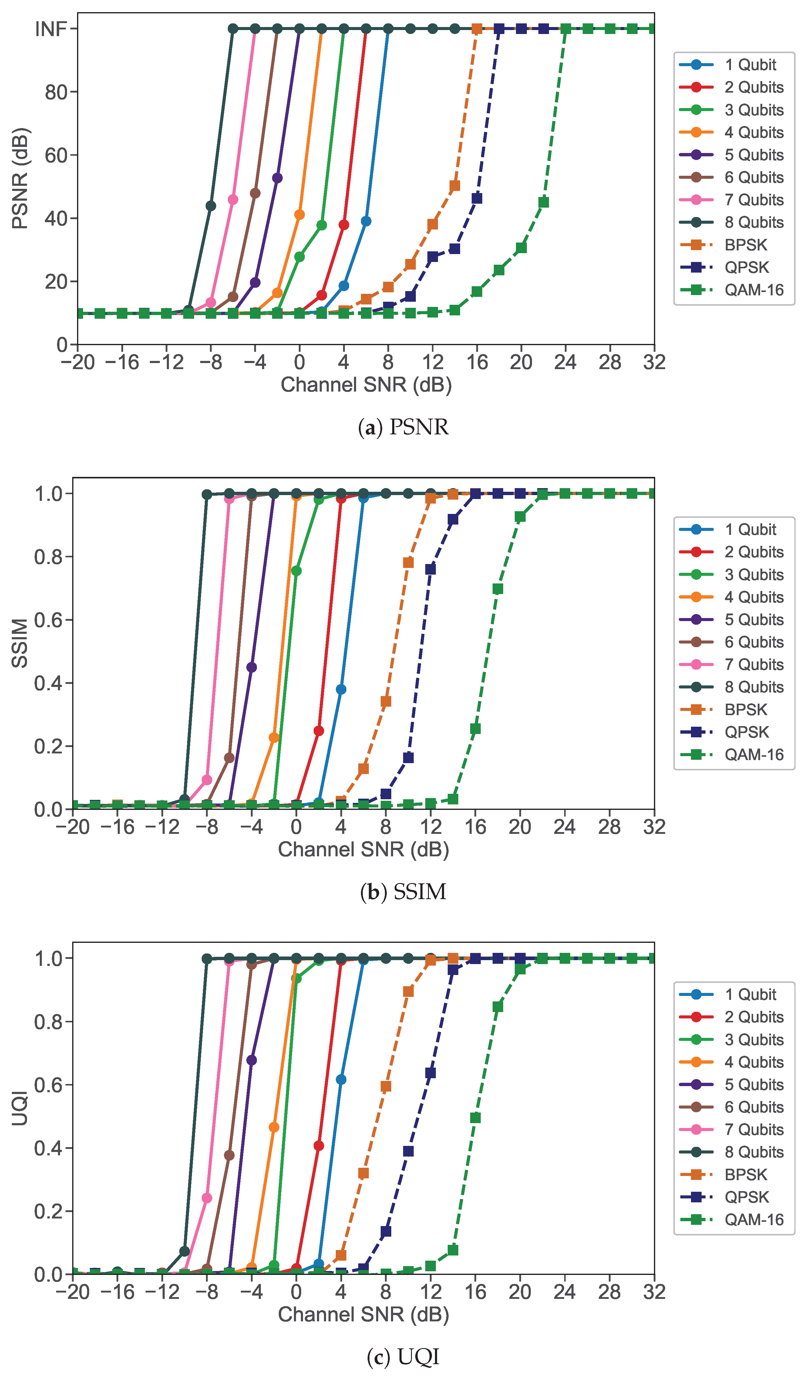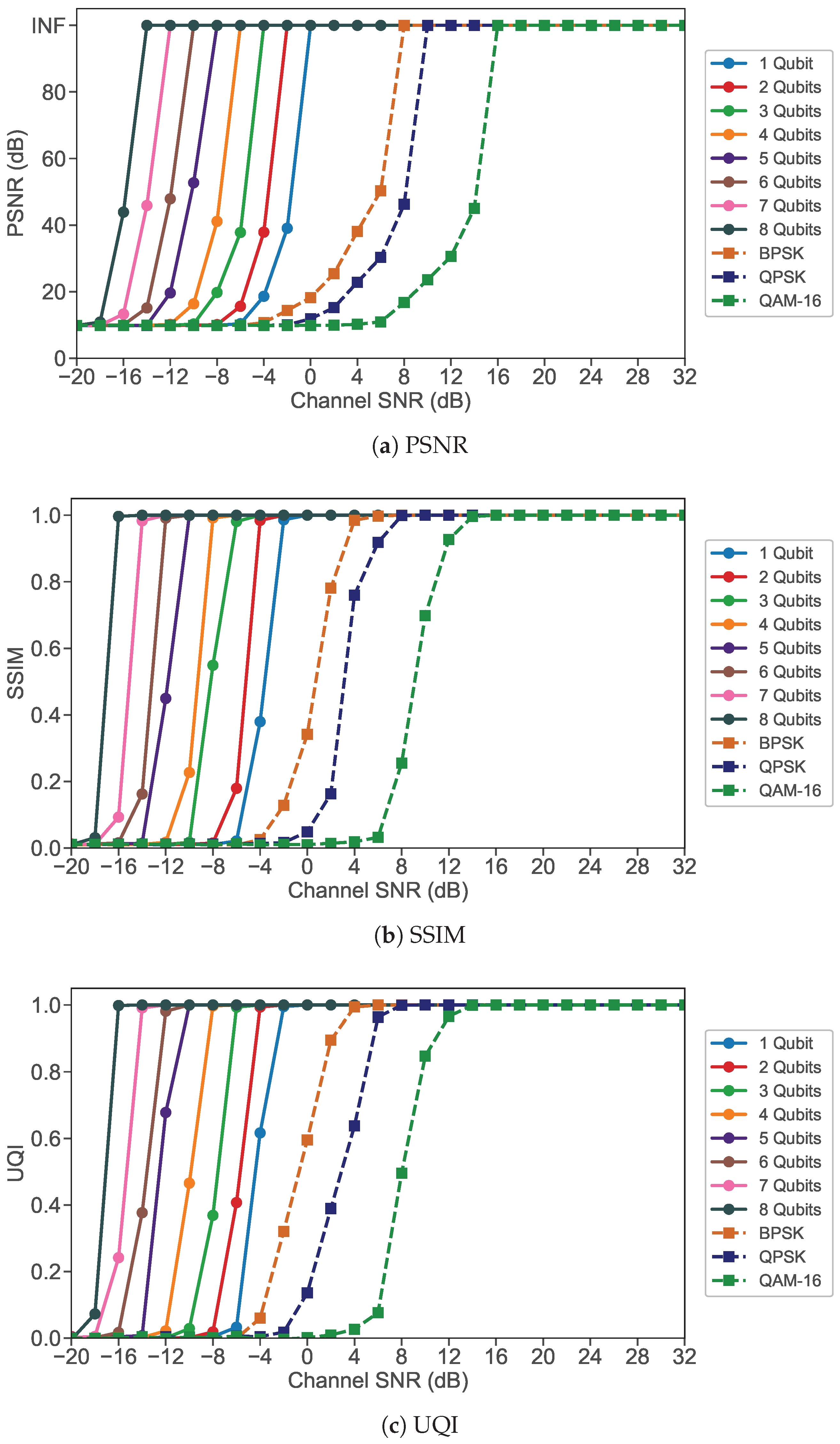 4.3. Performance Comparison of Uncompressed Image Transmission Using Quantum MIMO-OFDM and Classical MIMO-OFDM Systems