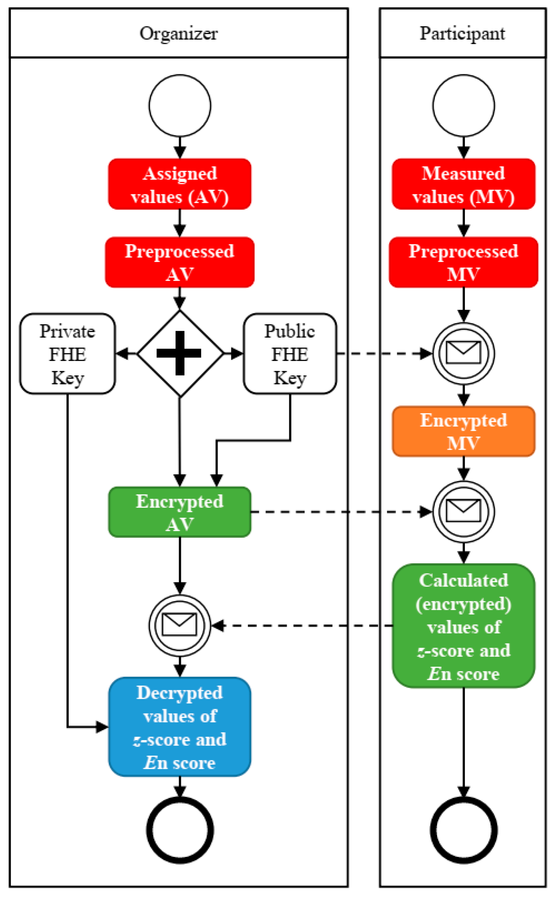 - A computation-efficient homomorphic formulation of z-score and En score based on plaintext pre-/post-processing plus ciphertext arithmetic, including a Newton–Raphson-based encrypted inversion to implement division without bootstrapping.
