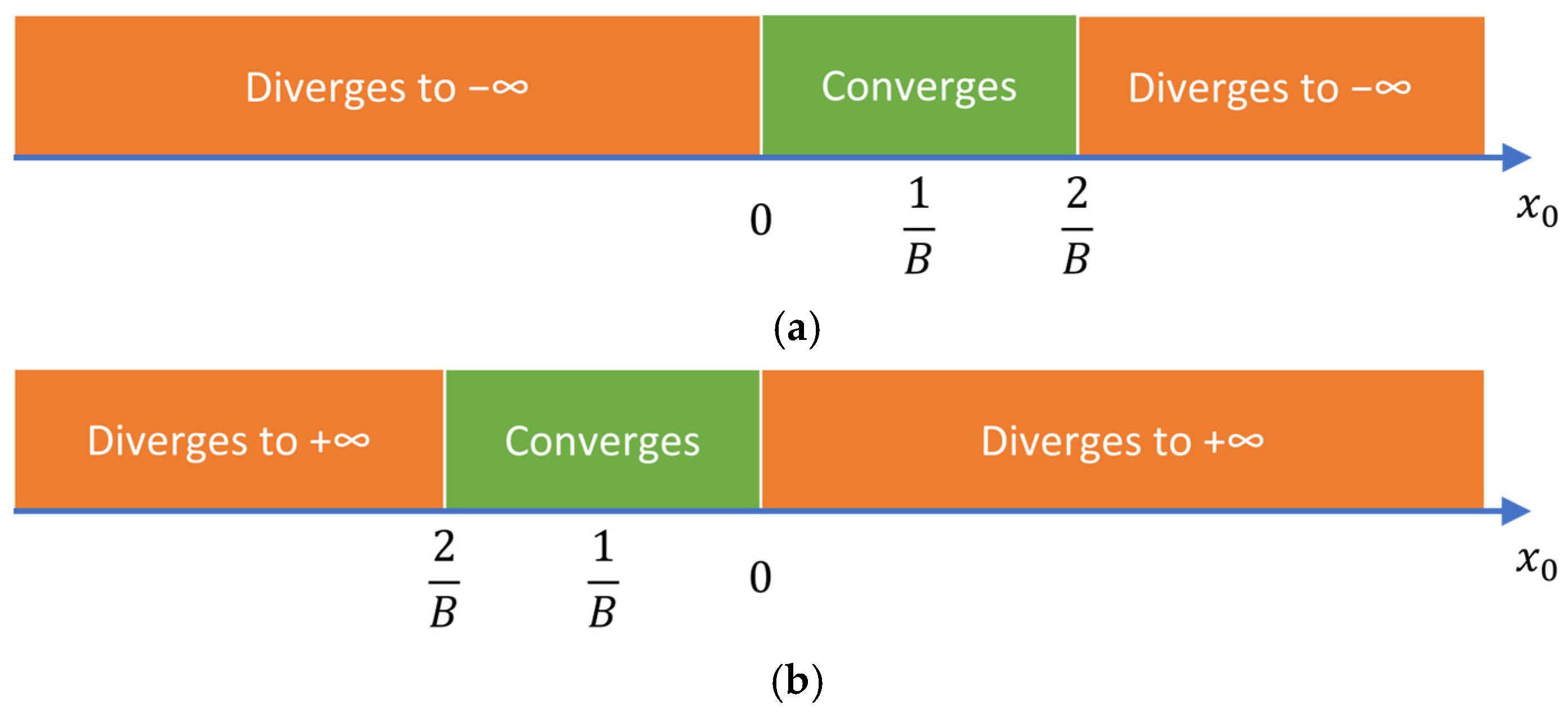| (−∞ to 0) | diverges to −∞ | (−∞ to 2/B) | diverges to +∞ |