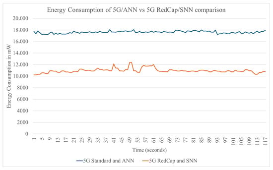 Energy consumption graph of 5G/ANN vs. 5G RedCap/SNN comparison.