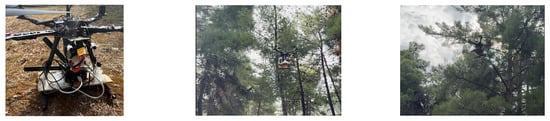 Experimental UAV setup with onboarded connectivity and processing modules, and snapshot during flights.