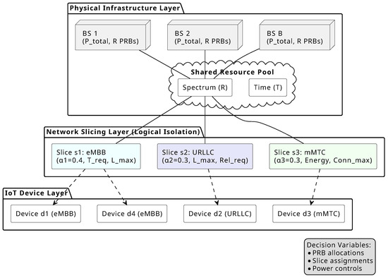 Figure 1 summarizes the considered 5G slicing architecture and the interaction between physical resources, network slices, and IoT devices. This separation is fundamental to our optimization formulation: the Physical Infrastructure Layer defines the resource constraints (6)–(10), the Network Slicing Layer enforces isolation requirements (7), and the IoT Device Layer determines the decision variables (, , ) subject to compatibility and QoS constraints (Equations (4), (5) and (11)–(13)). The resource allocation fractions partition the spectrum among slices while maintaining , ensuring no resource over-subscription. This architectural view motivates the bi-objective formulation: operational costs arise from physical resource consumption (power budget , PRB utilization), while QoS depends on per-slice requirements and device priorities.