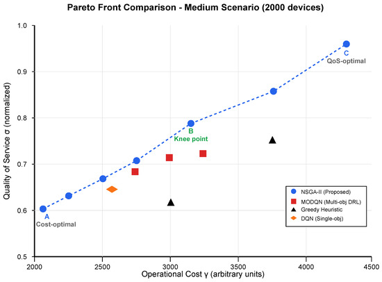 In dense 5G deployments supporting heterogeneous IoT services, network operators must continuously trade off operational costs against strict per-slice QoS requirements, particularly under time-varying traffic and energy conditions. This scenario exemplifies the fundamental need for explicit multi-objective optimization that exposes the cost–QoS Pareto frontier, enabling operators to make informed trade-offs based on time-of-day pricing, regulatory requirements, or service differentiation strategies.