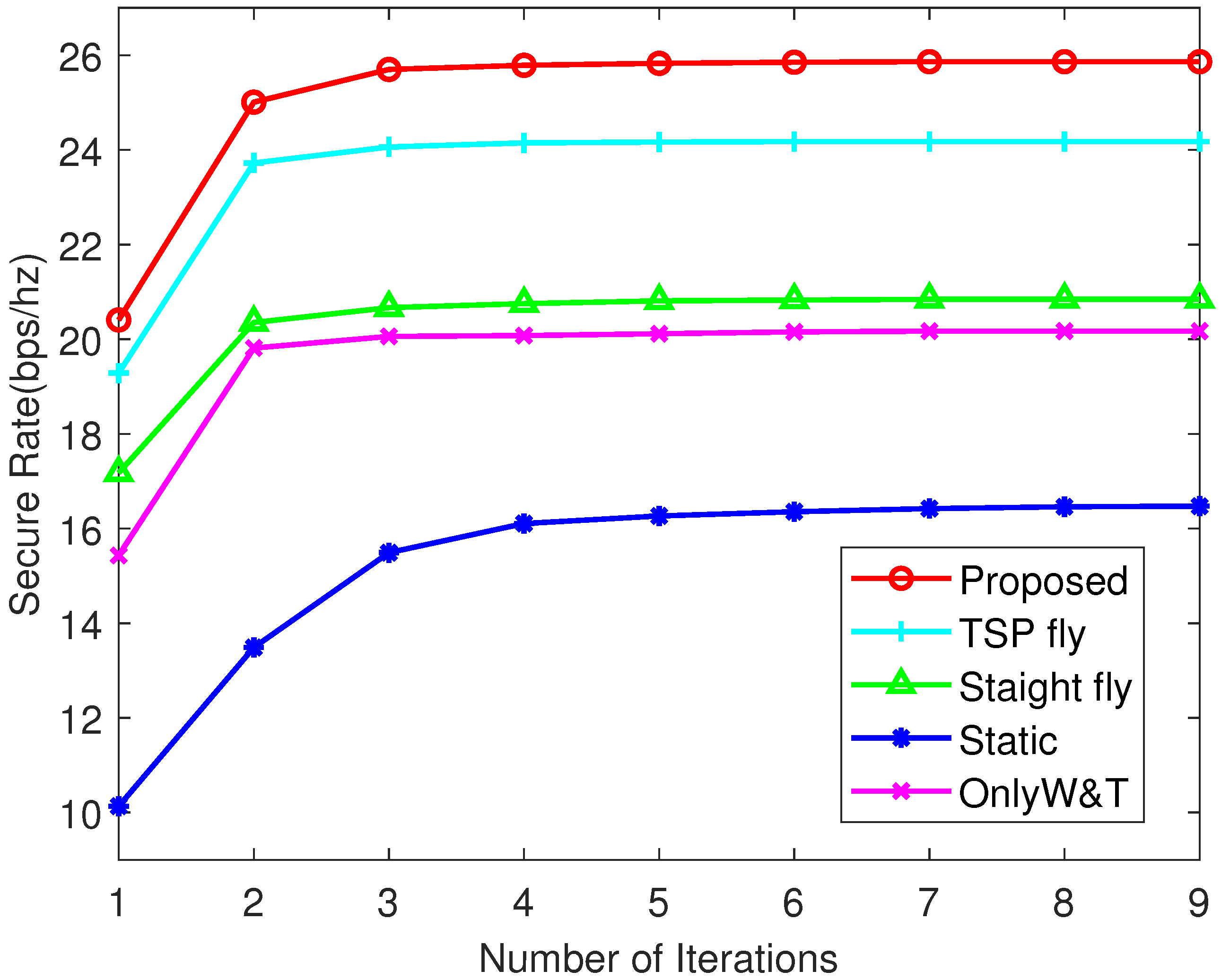 - Numerical results demonstrate the convergence performance of the proposed algorithm, and further show that it significantly improves the secure communication rate of the U-ISJC network compared to the benchmark schemes.