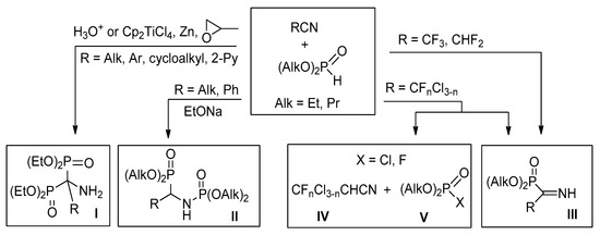 Analysis of the literature data shows that hydrophosphoryl compounds can react with nitriles by different schemes. Thus, reaction of dialkylphosphites with alkyl, cycloalkyl, aryl, or pyridyl nitriles in the presence of acids [13,14] or under free radical conditions [15] leads to aminobisphosphonates I, as the main products, formed in low to moderate yields (Scheme 1). At the same time, under basic conditions benzonitrile reacts with dialkyl or diphenyl phosphites to form phosphorylamino phosphonates II [16]. Recently we have shown that highly electrophilic polyfluoroalkylated nitriles in the reactions with dialkyl or diphenyl phosphite afford first representatives of NH-iminophosphonates III [17,18]. At the same time, mixed perfluoro(chloro) acetonitriles react with (RO)2POH (R = Et, Ph) by two competitive routes: addition to the C≡N bond affording the respective N-unprotected iminophosphonates III, or reductive dehalogenation leading to chloro(fluoro) acetonitriles IV and the respective halogenophosphates V [19].