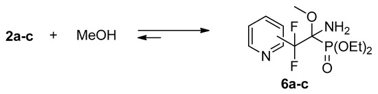 Iminophosphonates 2 contain a polarized C=N bond activated by the presence of electron-withdrawing group at the imine carbon atom. Thus, imines 2a–c readily add methanol across the C=N bond to afford adduct 6a–c (Scheme 3). The reactivity decreases in the order 2a > 2b,c: after 8 h the conversion is 100%, 44%, and 46%, respectively. The complete conversion of 2b,c proceeds within 2 days.