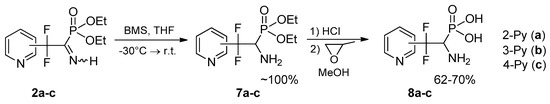 4.4. Synthesis of (1-Amino-2,2-difluoro-2-(pyridinyl)ethyl)phosphonic Acids 8a–c: General Procedure