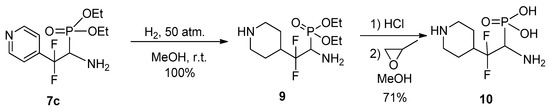 The possibility of reducing the pyridine ring was studied using compound 7c as the most stable pyridyl substituted aminophosphonate. It was found that catalytic hydrogenation of 7c leads to complete reduction of pyridine ring to afford 4-piperidyl substituted aminophosphonate 9 (Scheme 5).