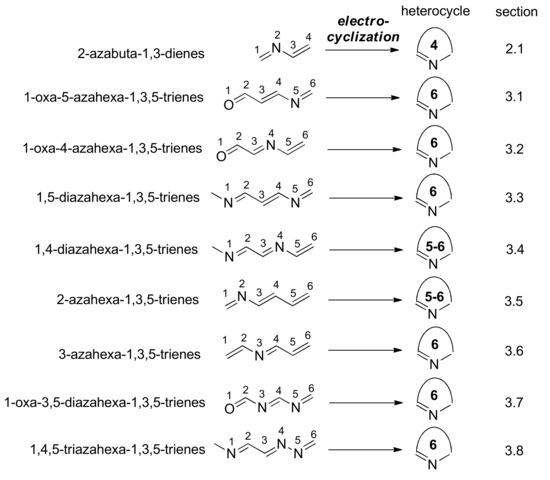 3. 1,6- and 1,5-Electrocyclizations of Aza-, Oxaza-, Diaza-, and Oxadiazahexatrienes