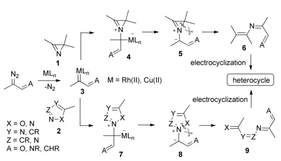 In this short review, we summarize recent progress on electrocyclic reactions of azapolyenes generated by the transition metal catalyzed reaction of diazo compounds/1,2,3-triazoles with 2H-azirines [25] or azoles containing the weak N-N or N-O bond.
