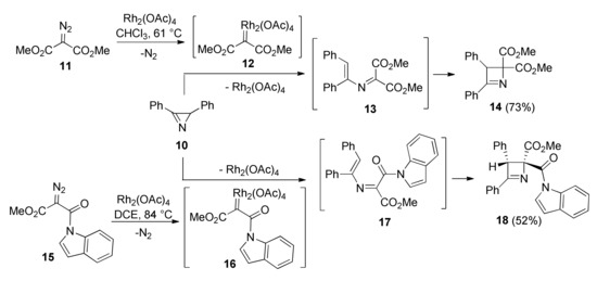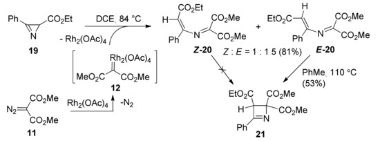 Theoretically, a 2-azabuta-1,3-diene fragment can undergo conrotatory 1,4-electrocyclization, which is allowed by the rules of orbital symmetry. Since the four-membered ring of a 2,3-dihydroazete is significantly strained, such cyclization is possible only when at least one substituent is present at the C4 of 2-azadiene and more favorable 1,5- or 1,6-cyclizations are difficult or impossible. In particular, 1,4-cyclization of 3,4-diphenyl-substituted azadiene 13 derived from 2,3-diphenyl-2H-azirine 10 and rhodium carbene 12 gave dihydroazete 14 in good yield under mild conditions (Scheme 2) [26,27]. The analogous reaction of azirine 10 with diazoamidoester 15 in 1,2-dichloroethane (DCE) resulted in the formation of dihydroazete 18 and revealed the stereoselective nature of both the formation of the intermediate azadiene 17 and its cyclization [28]. It is notable that the cyclizations of azadienes 13 and 17 occurred irreversibly in both cases.