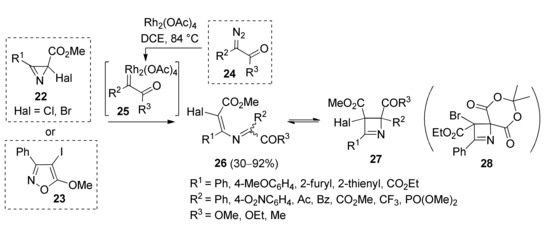 The reaction of rhodium carbenes with azirines and isoxazoles is still the only way to synthesize 2,3-dihydroazetes having a carbon substituent at C4. Despite the low thermal stability of many representatives of these compounds, they can be easily detected in reaction mixtures due to the characteristic chemical shift of C4 in the 13C NMR spectra, which is about 190 ppm.