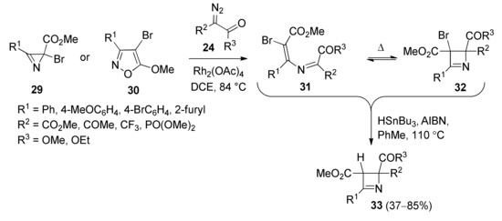 To obtain dihydroazetes with a hydrogen at the C3, an approach was developed based on the hydrodebromination of 3-bromo-2,3-dihydroazetes under the action of tributyltin hydride (Scheme 5) [29]. Using this method, 2,3-dihydroazetes 33 with various substitution patterns were obtained in good yields from both 2-bromoazirine-2-carboxylates 29 and 5-alkoxy-4-bromoisoxazoles 30. It is noteworthy that the replacement of bromine with hydrogen in 2,3-dihydroazetes led to a significant increase in their thermal stability: in contrast to dihydroazetes 32, which undergo the ring opening to azadienes 31 at temperatures above 60 °C, dihydroazetes 33 are stable even at 150 °C. In addition, the cytotoxic activity of 2,3-dihydroazetes 32 and 33 on the THP-1 cell line (human monocytic leukemia cells) was studied in vitro. It was found that the maximum apoptotic potential, along with a high cytotoxic and minimal necrotic potential, can be displayed by a representative of 2,3-dihydroazetes 33—trimethyl-4-phenyl-2,3-dihydroazete-2,3,3-tricarboxylate.