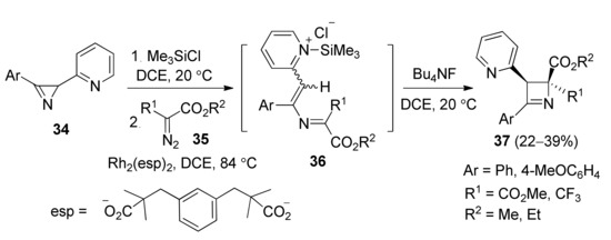 For the synthesis of 2,3-dihydroazetes 37 bearing a 2-pyridyl substituent at C3, it was necessary to protect the pyridine nitrogen in the starting 2-(pyridin-2-yl)-2H-azirines 34 in order to avoid deactivation of the rhodium catalyst due to complexation (Scheme 6) [33]. For this purpose, one-pot protection/deprotection with a trimethylsilyl group was successfully used.