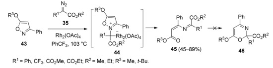 Manning and Davies reported the rhodium catalyzed synthesis of 2H-1,3-oxazines 42 from diazocarbonyl compounds 35 and isoxazoles 39 (Scheme 7) [37]. The authors proposed the mechanism for the formation of oxazine 42 involving the generation of isoxazolium ylide 40, the ring opening to 1-oxa-5-azatriene 41, followed by 1,6-electrocyclization. The scope of the reaction was further expanded by the work in [38].