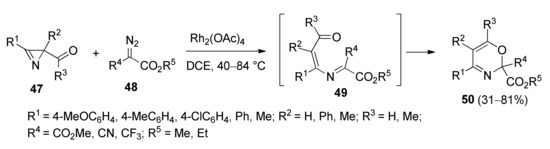 It was also shown that 2-acyl- and 2-formyl-substituted azirines 47 react similarly and can serve as sources of oxazatrienes 49, which are capable of undergoing 1,6-electrocyclization (Scheme 9). Thus, dimethyl diazomalonate, ethyl 2-cyano-2-diazoacetate, and ethyl 2-diazo-3,3,3-trifluoropropanoate react with azirines 47 under rhodium catalysis to afford 2H-1,3-oxazines 50 in good yields [39,40].