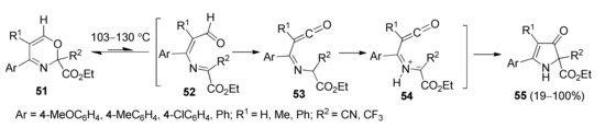 It turned out that the obtained 1,3-oxazines are capable of reversible ring opening to 1-oxa-5-azahexatrienes at elevated temperatures (Scheme 10) [40]. 1,3-Oxazine 51 bearing a hydrogen atom at C6 produces oxazatriene 52 upon heating, which undergoes a cascade of transformations, leading to the formation of pyrrolinones 55. This isomerization occurs most easily for the 1,3-oxazines containing a cyano group at C2. The synthesis of pyrrolones 55 can also be carried out starting from azirines and diazo compounds, without isolation of the intermediate 1,3-oxazines.