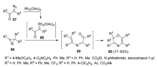 - Rostovskii, N.V.; Novikov, M.S.; Khlebnikov, A.F.; Khlebnikov, V.A.; Korneev, S.M. Rh(II)-carbenoid mediated 2H-azirine ring-expansion as a convenient route to non-fused photo- and thermochromic 2H-1,4-oxazines. Tetrahedron 2013, 69, 4292–4301. [Google Scholar] [CrossRef]