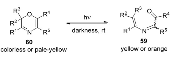 An interesting feature of the obtained monocyclic 2H-1,4-oxazines 60 is their photo- and thermochromic activity, which is attractive for their practical applications. When irradiated with UV light of a mercury lamp, colorless oxazines (λmax 315–360 nm) convert to oxazatrienes 59, colored from yellow to red (λmax 380–455 nm) [42] (Scheme 12). After the termination of irradiation, the cyclization occurs again. For a series of oxazines, the half-life times of the open-chain form were determined; these were in a range of 0.5–29 h, and these times were highly dependent on the substitution pattern. Thermochromism was most pronounced for spirooxazines containing a fluorene fragment at C2 [42].