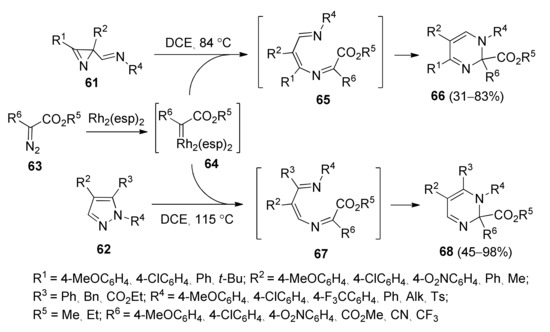 1,6-Electrocyclization of 1,5-diazahexa-1,3,5-trienes occurs with the formation of 1,2-dihydropyrimidine derivatives. Two complementary approaches have been developed for the generation of 1,5-diazatrienes 65,67, precursors of 1,2-dihydropyrimidines 66,68, based on the reactions of diazocarbonyl compounds 63 with either azirine-2-carbaldimines 61 or pyrazoles 62 (Scheme 13). The use of azirine-2-carbaldimines as the starting material makes it possible to obtain 1,2,2,4,5-pentasubstituted dihydropyrimidines [44]. Due to the peculiarities of the reactivity of pyrazoles (completely substituted pyrazoles do not react with rhodium carbenes), the reactions of pyrazoles are more suitable for obtaining 1,2,2,5,6-pentasubstituted dihydropyrimidines [45].