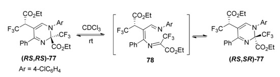 It is interesting that the synthesized 1,2-dihydropyrimidines exist in an equilibrium with 1,5-diazatrienes in solution at room temperature [44]. An indirect evidence of this fact, which was also confirmed by the results of quantum chemical calculations, is the rapid epimerization of a dihydropyrimidine, which contains two chiral centers. Thus, dihydropyrimidine (RS,RS)-77, which is stable in a solid state, rapidly transforms into a 1:1 mixture of two diastereomers in CDCl3 solution via the ring opening–cyclization sequence (Scheme 15).