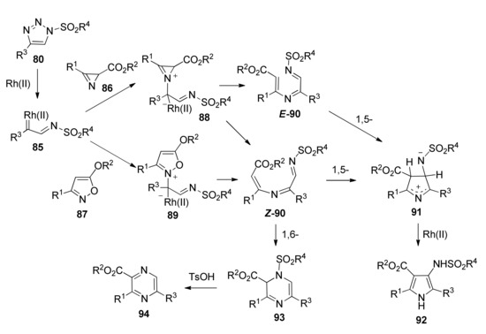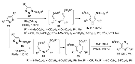 The reaction of isoxazoles 79 with rhodium azavinyl carbenes, generated from 1-sulfonyl-1,2,3-triazoles 80 under rhodium(II) catalysis, allows for the generation of 1,4-diazahexa-1,3,5-trienes 81 with a sulfonyl substituent at N1 [46]. In these reactions, two products were formed: 3-aminopyrrole 82 and 1,2-dihydropyrazine 83 (Scheme 16). The result of the reaction turned out to be extremely sensitive to reaction conditions (catalyst, solvent, temperature, etc.). The reaction, carried out in chloroform at 100 °C in the presence of Rh2(OAc)4 as a catalyst, is most suitable for the synthesis of 4-aminopyrrole-3-carboxylates 82. The use of dirhodium tetrapivaloate (Rh2(Piv)4) in boiling toluene led to the formation of 1,2-dihydropyrazine-2-carboxylates 83 as the major products. The dihydropyrazines 83 were not very stable and gradually underwent dehydrosulfonylation; for this reason, they were converted without isolation to aromatic pyrazines 84 in the presence of TsOH.