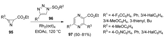 - Ryu, T.; Baek, Y.; Lee, P.H. Synthesis of Pyrazines from Rhodium-Catalyzed Reaction of 2H-Azirines with N-Sulfonyl 1,2,3-Triazoles. J. Org. Chem. 2015, 80, 2376–2383. [Google Scholar] [CrossRef] [PubMed]