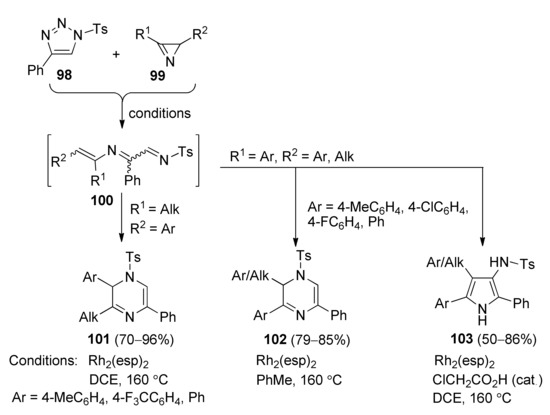 1,4-Diazahexatrienes 100 containing an aryl or alkyl substituent at the C6 and an aryl substituent at the C5 can be converted to dihydropyrazines 102 or 3-aminopyrroles 103 depending on the reaction conditions (Scheme 19) [49]. Tang and coworkers reported the conditions that provided good yields of both cyclic products. In contrast, 1,4-diazahexatrienes 100 containing an aryl substituent at C6 and an alkyl substituent at the C5 position exclusively underwent 1,6-electrocyclization to give dihydropyrazines 101.