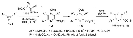 Park and coworkers showed that azirines 104 can react with diazo oxime ethers 105 under catalysis with copper(II) hexafluoroacetylacetonate (Scheme 20) [50]. In this case, 1,4-diazahexatrienes 106 are formed as intermediates, which are capable of undergoing 1,6-electrocyclization to dihydropyrazines 107. Upon further heating of the dihydropyrazines at high temperature, the elimination of methanol takes place, leading to the formation of completely substituted pyrazine-2-carboxylates 108 in good yields.