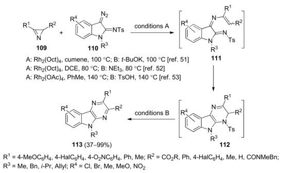 The reactions of diazoindolinimines 110 with various 2H-azirines 109 give ortho-fused pyrazines 113 resulting from the 1,6-electrocyclization of intermediate 1,4-diazatrienes 111. These reactions have been studied in detail in the works of three research groups (Scheme 21) [51,52,53]. In all these studies, the formation of the intermediate 1,2-dihydropyrazines 112 was observed. It was found that the aromatization of the 1,2-dihydropyrazines 112 can occur without any additives (when R2 = CO2Me), but at rather high temperature. To carry out this process under milder conditions, it was necessary to add a base (Et3N, t-BuOK) or TsOH. Under these conditions, 5H-pyrazino[2,3-b]indoles 113 were obtained in good yields.