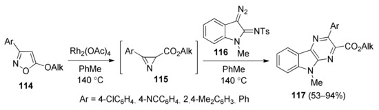 To obtain 5H-pyrazino[2,3-b]indoles 117 containing an ester substituent, according to the results of previous studies, it would be more convenient to use 5-alkoxyisoxazoles 114 rather than azirines 115 (Scheme 22). Unfortunately, however, isoxazoles 114 proved to be inactive toward diazoindolinimines in the presence of rhodium carboxylates. The authors of the work [53] took advantage of the isomerization of 5-alkoxyisoxazoles 114 to azirine-2-carboxylates 115 found in a previous study. It was found that the isomerization is catalyzed by the same rhodium carboxylate as the subsequent reaction with the diazo compound. Using this procedure, a number of pyrazinoindoles 117 bearing an ester substituent were obtained in good yields.