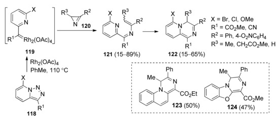 The rhodium-catalyzed reactions of azirines 120 with ortho-fused triazoles, [1,2,3]triazolo[1,5-a]pyridines 118, have been studied in [54] (Scheme 23). The final products of the reaction were previously unknown 4H-pyrido[1,2-a]pyrazine derivatives 122, which resulted from 1,6-electrocyclization of 1-(pyridin-2-yl)-2-azabuta-1,3-dienes 121 (1,4-diazahexa-1,3,5-trienes with the terminal C=N bond as part of the pyridine system). This process is quite remarkable because it belongs to a rare type of electrocyclization accompanied by the dearomatization of a pyridine ring.
