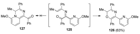 It was found that such 1,6-electrocyclization has limitations with respect to the substituents at the 2-azabutadiene [54]. The cyclization occurs for azadienes 121 bearing an electron-withdrawing substituent at C1 and a hydrogen atom, an alkyl, or aryl group at C4. The 4-alkyl-substituted pyridopyrazines 122 were found to be stable at room temperature and were isolated in moderate yields. Pyridopyrazines 122 with an aryl group at C4 exist in equilibrium with the corresponding 1,4-diazahexa-1,3,5-trienes 121, even at room temperature. 1,6-Electrocyclization is also possible with the participation of the C=N bond of a quinoline and a benzoxazole (compounds 123 and 124). According to the results of quantum chemical calculations, the 1,6-electrocyclization under consideration is a pseudopericyclic reaction proceeding through a significantly flattened transition state. It is noteworthy that 3-benzoyl-substituted 1,4-diazahexa-1,3,5-triene 125, formed from the corresponding pyridotriazole, undergoes cyclization to 2H-1,4-oxazine 126, rather than to 4H-pyrido[1,2-a]pyrazine 127 (Scheme 24).