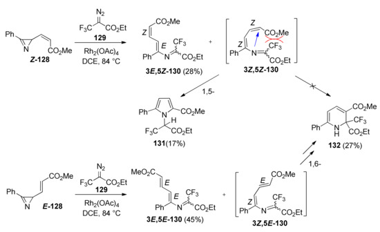 The introduction of an alkenyl substituent at C4 of the 2-azabuta-1,3-diene system led to 2-azahexa-1,3,5-trienes, which can undergo 1,6-electrocyclization to dihydropyridines. Indeed, the reaction of alkenyl-substituted azirine E-128 with diazo compound 129 in the presence of Rh2(OAc)4 led to azahexatriene 3E,5E-130 and dihydropyridine 132. A similar reaction of the isomeric azirine Z-128 gave azahexatriene 3E,5Z-130 and pyrrole 131 (Scheme 25) [55,56]. Dihydropyridine 132 is the result of 1,6-electrocyclization of the unstable azatriene 3Z,5E-130 and subsequent prototropic shift, while pyrrole 131 is the product of 1,5-electrocyclization of the unstable azatriene 3Z,5Z-130. Thus, the configuration of the terminal C=C bond in (3Z)-2-azahexa-1,3,5-trienes 130 completely controls the direction of their cyclization. Following from the quantum chemical calculations, in the transition states of the 1,6-electrocyclizations of azatrienes with the Z configuration of the terminal C=C bond, in contrast to the E isomer, there were noticeable steric repulsive interactions created by the CO2Me group at the C6 and a substituent at the C1. As a result, the barrier of the 1,6-electrocyclization increases, and the pseudopericyclic 1,5-electrocyclization becomes more preferable.