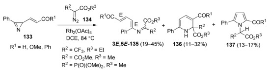 The pathways of the azirine ring expansion in the Rh2(OAc)4-catalyzed reactions of various 2-carbonylvinyl-substituted azirines 133 with diazo esters 134 were also studied (Scheme 26) [56]. In all cases, the formation of dihydropyridines 136 and pyrroles 137, along with the formation of stable azahexatrienes 3E,5E-135, was observed, with the proportion of the pyrrole increasing with an increase in volume of a substituent at the C1 (phosphonate, R2 = P(O)(OMe)2) or C6 (benzoyl group, R1 = Ph) of the azahexatriene.