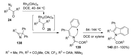 2-Azadienes 139 (2-azahexa-1,3,5-trienes with the terminal C=C bond as a part of the benzene system) containing two phenyl substituents at the C4 and two electron-withdrawing groups at the C1 undergo unusual 1,5-electrocyclization involving the C=C bond of the aromatic ring to give indole derivatives 140 (Scheme 27). On the basis of this reaction, an efficient method for the synthesis of N-substituted indoles 140 from 2,2-diphenyl-2H-azirines 138 and diazocarbonyl compounds 24 without isolation of the intermediate azahexatrienes 139 was developed [28]. It was found that an increase in the electron-withdrawing ability of substituents at the C1 of 2-azabutadienes facilitates the indole formation. Particularly, the azahexatriene containing an alkoxycarbonyl and cyano group at C1 isomerized smoothly to the corresponding indole, even at room temperature.