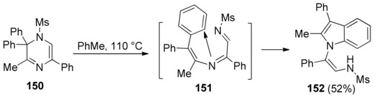 Analogously, the formation of indoles did not occur in the case of fluorene and anthrone derivatives of 1,4-diazahexa-1,3,5-triene (Scheme 34) [58]. As in previous cases, the rhodium-catalyzed reaction of azirines 165 with 1,2,3-triazoles 166 resulted in the initial formation of dihydropyrazines 167, which upon further heating afforded spirocyclic 3H-pyrroles 169, 170 via the 5-exo-trig-cyclizaion of azapolyene 168, rather than indoles resulting from its 1,5-electrocyclization.