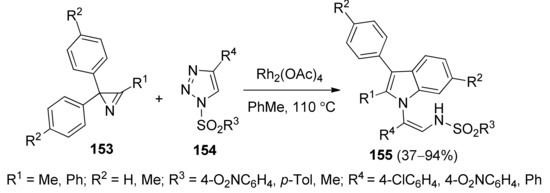 - Khaidarov, A.R.; Rostovskii, N.V.; Zolotarev, A.A.; Khlebnikov, A.F.; Novikov, M.S. Synthesis of 1-(2-Aminovinyl)indoles and 1,3′-Biindoles by Reaction of 2,2-Diaryl-Substituted 2H-Azirines with α-Imino Rh(II) Carbenoids. J. Org. Chem. 2019, 84, 3743–3753. [Google Scholar] [CrossRef]