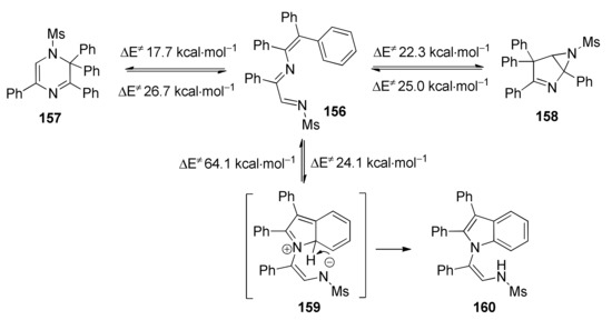 - Novikov, M.S.; Khlebnikov, A.F.; Rostovskii, N.V.; Tcyrulnikov, S.; Suhanova, A.A.; Zavyalov, K.V.; Yufit, D.S. Pseudopericyclic 1,5- versus pericyclic 1,4- and 1,6-electrocyclization in electron-poor 4-Aryl-2-azabuta-1,3-dienes: Indole synthesis from 2H-azirines and diazo compounds. J. Org. Chem. 2015, 80, 18–29. [Google Scholar] [CrossRef]