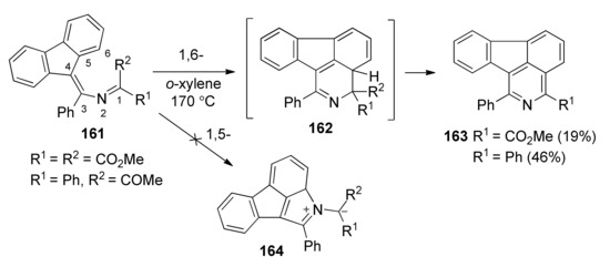The presence of a fluorene system at C4 of 2-azabutadiene moiety (2-azahexa-1,3,5-trienes with the terminal C=C bond as a part of the fluorene system) led to a change in the reaction course from 1,5-cyclization to 1,6-cyclization, giving rise to azafluoranthene derivatives [28]. In particular, azahexa-1,3,5-trienes 161 was converted by heating at 170 °C in o-xylene to 2-azafluoranthenes 163 in moderate yields (Scheme 33). The change in the cyclization mode on going from the gem-diphenyl to the fluorene system can be explained by a decrease in stability of the transition state, leading to a strained indeno[1,2,3-cd]indolium ylide 164.