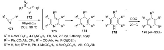 A rhodium(II)-catalyzed reaction of diazo compounds 172, containing an alkenyl substituent, with 2,3-disubstituted 2H-azirines 171 was used to generate 3-azahexa-1,3,5-trienes 173 (Scheme 35) [59,60]. These intermediates readily underwent 1,6-electrocyclization to 3,4-dihydropyridines 174, which tautomerized to 1,4-dihydropyridines 175. The oxidation of the latter in a one-pot mode by using 2,3-dichloro-5,6-dicyano-1,4-benzoquinone (DDQ) allowed the preparation of pyridines 176 bearing a wide range of substituents in moderate to high yields. In one case, the authors were able to isolate a 3-azahexatriene intermediate, which was transformed to a pyridine derivative at elevated temperature.