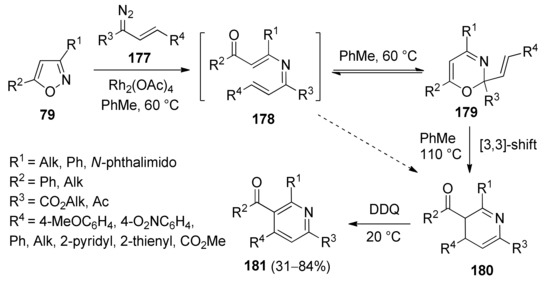 In a similar manner, isoxazoles can be successfully used in rhodium-catalyzed reactions with diazo compounds bearing an alkenyl substituent for the preparation of substituted pyridines. Manning and Davies reported the reaction of isoxazoles 79 with diazo compounds 177 catalyzed with Rh2(OAc)4 at 60 °C, which afforded 1,3-oxazines 179 (Scheme 36) [61]. When refluxed in toluene, the latter were converted to 3,4-dihydropyridines 180. This transformation can be assumed to proceed either through the Cope rearrangement or through the ring opening to 1-oxa-5-azaoctatetraenes 178, followed by 1,6-electrocyclization. Further oxidation of the dihydropyridines with DDQ led to the formation of pyridines 181 with a carbonyl substituent at C3.