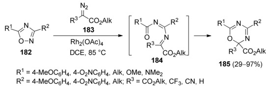 In the reaction of 1,2,4-oxadiazoles 182 with rhodium carbenes generated from α-diazoesters 183, 1-oxa-3,5-diazahexa-1,3,5-trienes 184 were generated as reactive intermediates (Scheme 37) [62]. Despite the possibility of several directions of electrocyclization, heteropolyenes 184 underwent 1,6-electrocyclization involving the carbonyl group (both ketone and ester one) located at the nitrogen atom. As a result, a wide variety of 2H-1,3,5-oxadiazines 185 were obtained in good yields. Interestingly, the reaction can be efficiently catalyzed not only by rhodium compounds, but also by cheaper copper compounds. The involvement of an ester group in the electrocyclization process is rather unexpected, since no electrocyclization products with the participation of such groups were observed in previous studies. According to the data of the DFT calculations, in this case, the cyclization onto the ester group is favorable for both kinetic and thermodynamic reasons.