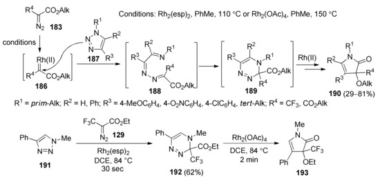 1,4,5-Triaza-1,3,5-hexatrienes 188, generated by the reaction of 1-alkyl-1H-1,2,3-triazoles 187 with rhodium α-carbonyl carbenes 186,derived from diazocarbonyl compounds 183, underwent 1,6-electrocyclization to 3,4-dihydro-1,2,4-triazines 189 (Scheme 38) [63]. Under the reaction conditions, the latter rapidly rearranged to pyrrolin-2-ones 190, which was accompanied by a nitrogen evolution, ring contraction, and 1,2-migration of the alkoxy substituent. To prove the intermediate formation of the 3,4-dihydro-1,2,4-triazines, the reaction of triazole 191 with 2-diazo-3,3,3-trifluoropropanoate 129 was carried out under milder reaction conditions. In this case, it was possible to isolate and characterize 3,4-dihydro-1,2,4-triazine 192, which turned out to be quite stable in pure form. Heating its solution in DCE in the presence of catalytic amounts of Rh2(OAc)4 led to a triazine ring contraction to give pyrrolinone 193.