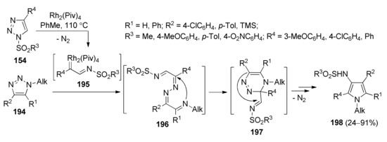 The reaction of 1-alkyl-1,2,3-triazoles 194 with rhodium azavinyl carbenes 195, derived from 1-sulfonyl-1,2,3-triazoles 154, begins in a similar manner via the 1,6-electrocyclization of azapolyenes 196 to unstable 1,3,4-triazines 197, which undergo, under the reaction conditions, denitrogenative ring contraction to give 3-sulfonamidopyrroles 198 (Scheme 39) [64]. According to the DFT calculations, the formation of pyrroles 198 from triazines 197 proceeds via a concerted rearrangement with a simultaneous nitrogen evolution followed by a 1,2-prototropic shift.