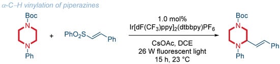 To expand the utility of this methodology, MacMillan and coworkers set out to explore the application of this protocol to the direct C–H vinylation of piperazines (Scheme 2) []. Vinyl sulfones were identified as the alkene coupling partners of choice for this reaction because of their electron-deficient properties that facilitate the radical addition and promote β-elimination. Although the proposed vinylation reaction proved to work under the previously developed conditions, the efficiency of this protocol was further improved by changing the catalyst system to IrIII[dF(CF3)ppy]2(dtbbpy)PF6/CsOAc/DCE to provide the product with high E-selectivity. Using the identified reaction conditions, (E)-(2-(phenylsulfonyl)vinyl)benzene was combined with the N1-Ph/N2-Boc piperazine to afford the corresponding product with an E:Z ratio of 94:6. Mechanistically, the authors proposed that C–H vinylation proceeded through a similar radical coupling pathway as C–H arylation (Scheme 1B).