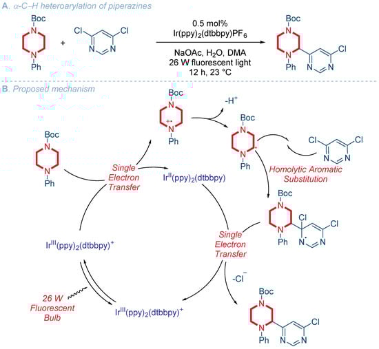 Based on their earlier work, MacMillan and coworkers reported the successful α-C–H heteroarylation of piperazines via a homolytic substitution pathway (Scheme 3A) []. In the previous protocols, functionalization was achieved using electron-deficient benzonitriles or vinyl sulfones as coupling partners. Mechanistically, this first reaction proceeded via a single electron transfer and radical-radical coupling, which generated an anion driving the reaction to completion. However, such transformation could be achieved by an alternative mechanism that would obviate the radical anion pathway. During the optimization of the α-heteroarylation reaction, IrIII(ppy)2(dtbbpy)PF6 was found suitable as a photocatalyst to oxidize the piperazine N-Ph atom via a single electron transfer. Mechanistically, the resulting amine radical cation is then deprotonated at the α-position of the nitrogen atom to give α-aminyl radical (Scheme 3B). The intermediate is then coupled to a heteroarene through homolytic aromatic substitution. This intermediate undergoes reduction with IrII(ppy)2(dtbbpy)PF6 via single electron transfer and the loss of chloride to afford the C–H heteroarylated product (Scheme 3B). This new mechanism permitted the utilization of a range of heteroarenes to achieve the direct α-C–H heteroarylation of piperazines.