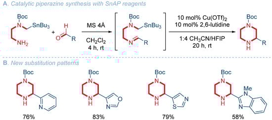 This SnAP chemistry developed by Bode and coworkers offers several major advantages in terms of ease of execution, functional group tolerance, and mild reaction conditions; however, the stochiometric use of copper decreases the efficiency of the reaction and limits its potential large-scale applications on the industrial level [,,]. Thus, research led by Bode and coworkers identified the conditions at which the synthesis of piperazines proceeds under catalytic amounts of copper by changing the solvent from 4:1 CH2Cl2/HFIP to 4:1 HFIP/CH3CN (Scheme 5) []. Importantly, this improved procedure permitted the expansion of the substrate scope in the synthesis of piperazines to engage previously inaccessible heterocyclic aldehydes for the functionalization at the C2 position, thus leading to a facile synthesis of α-heteroarylated piperazines.