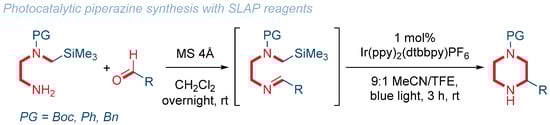 - Hsieh, S.-Y.; Bode, J.W. Silicon Amine Reagents for the Photocatalytic Synthesis of Piperazines from Aldehydes and Ketones. Org. Lett. 2016, 18, 2098–2101. [Google Scholar] [CrossRef]